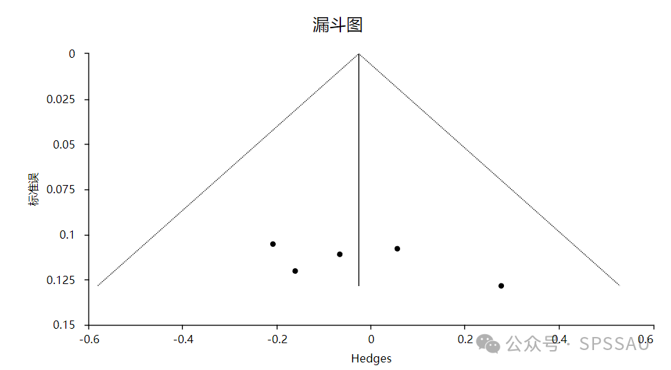 漏斗图时,横坐标为效应量,纵坐标为标准误差值(并且纵坐标进行逆向),如果说各散点介于漏斗内两侧并且基本上呈现出对称状态,那么意味着没有发表偏倚问题。