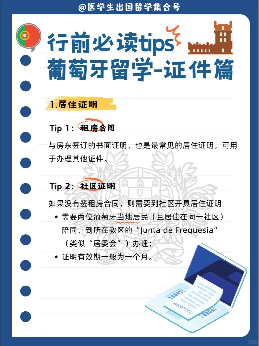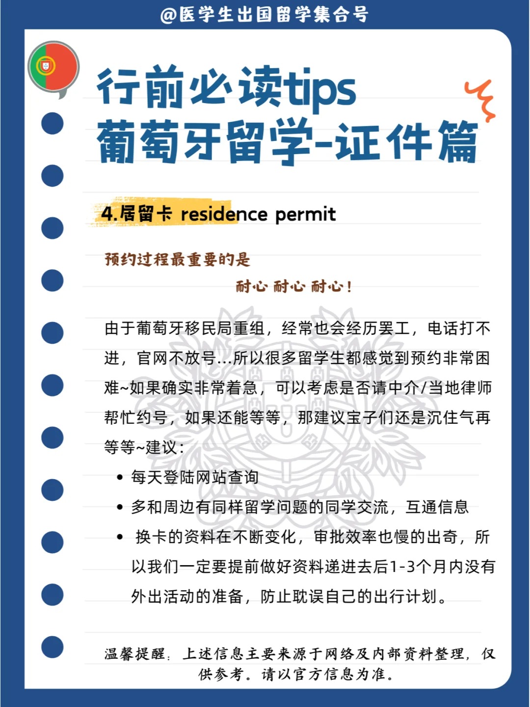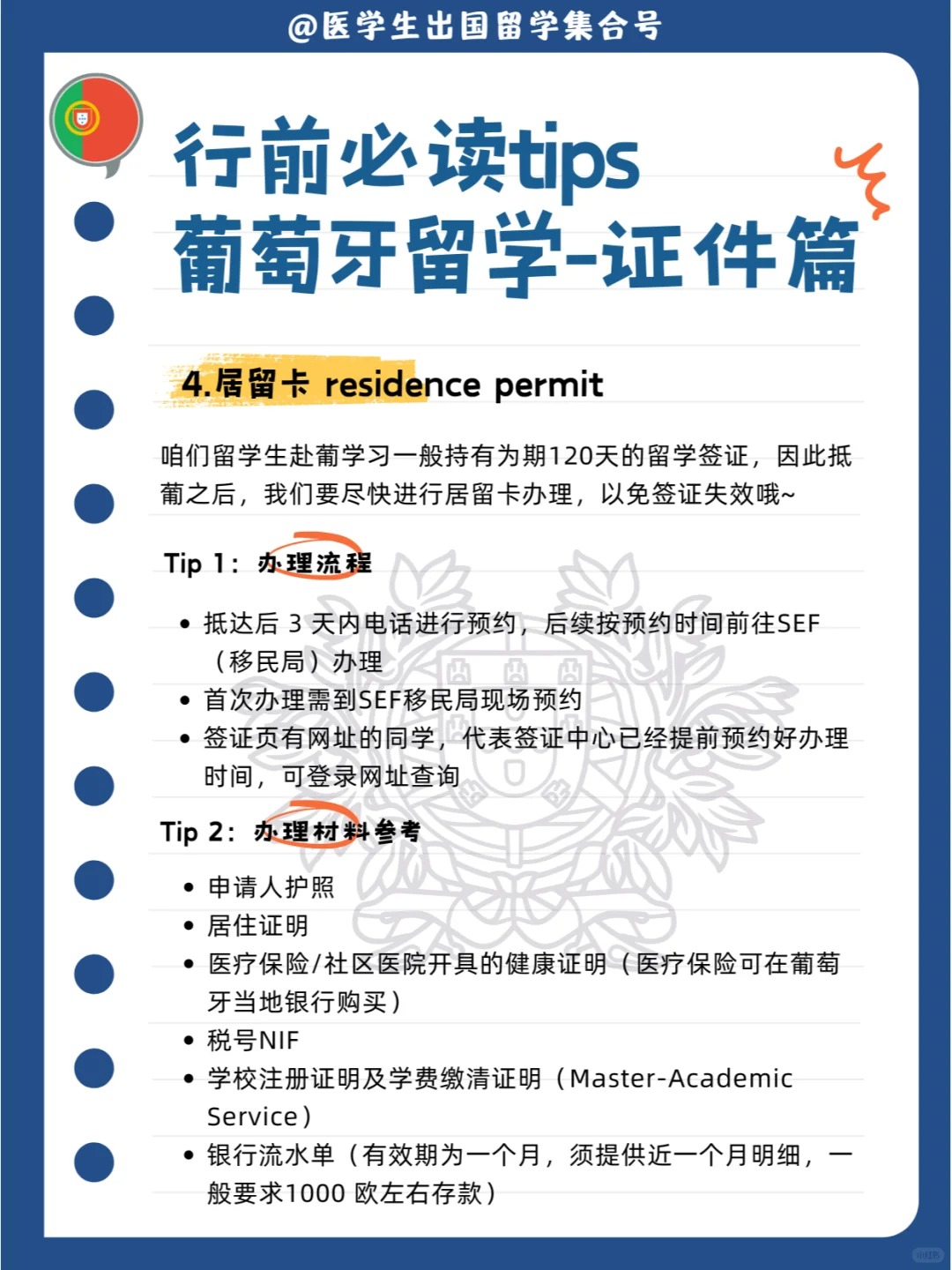 出国留学,除了护照和签证外,还有哪些证件我们需要拥有呢?相信已经拿到葡萄牙留学签的宝子们也留意到,即使是申请一年停留,最终下发的签证有效期也一般为120天,这就意味着我们要好好准备抵葡后的换发居留卡等各项证件准备哦~接下来我们也整理了葡萄牙留学行前锦囊给大家提供参考!