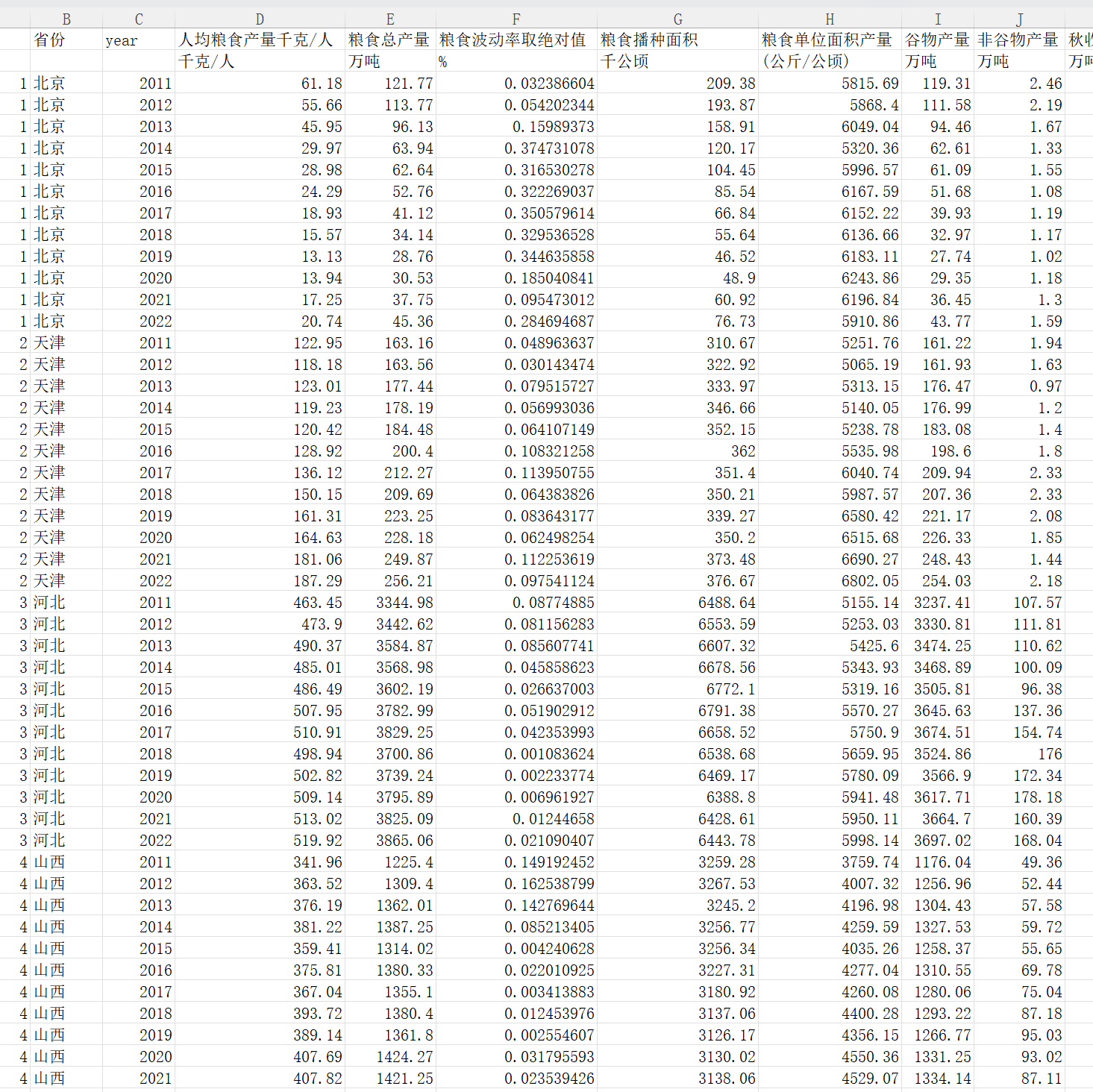 12.单位粮食产量使用耕地面积:耕地资源是粮食生产中重要的投入要素。利用单位粮食产量使用耕地面积衡量粮食的资源安全。单位粮食产量使用耕地面积越小,对粮食安全的保障程度越高。