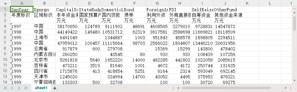 年度标识 区域标识 本年资金来源小计 国家预算内资金 国内贷款 债券 利用外资 外商直接投资 自筹资金 其他资金来源