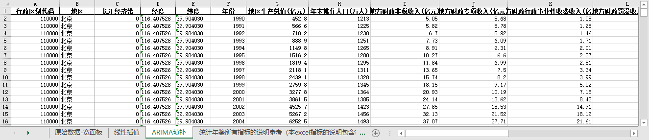 excel数据文件包原始数据-宽面板(由于多年度指标不同存在缺失值)、线性插值、ARIMA填补三个版本,提供您参考使用。