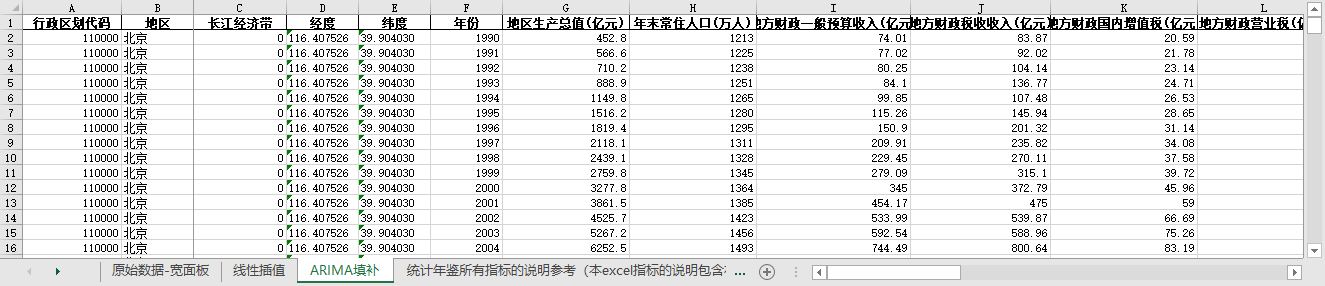 excel数据文件包原始数据-宽面板(由于多年度指标不同存在缺失值)、线性插值、ARIMA填补三个版本,提供您参考使用。