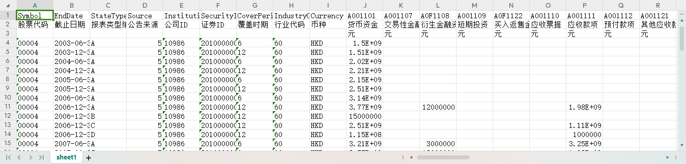 股票代码 截止日期 报表类型编码 公告来源 公司ID 证券ID 覆盖时期 行业代码 币种 货币资金 交易性金融资产 衍生金融资产 短期投资 买入返售金融资产 应收票据 应收款项 预付款项 其他应收款 应收利息 应收股利 存货 一年内到期的非流动资产 其他流动资产 流动资产合计 贷款及垫款 可供出售金融资产(待售证券) 持有至到期投资(持有证券) 长期股权投资 长期投资 长期应收款 投资性房地产净额 固定资产净额 在建工程净额 工程物资 固定资产清理 生产性生物资产净额 油气资产净额 无形资产净额 商誉净额 开发支出 长期待摊费用 递延所得税资产 其他非流动资产 非流动资产合计 资产总计 短期借款 交易性金融负债 衍生金融负债 卖出回购金融资产款 应付票据 应付账款 预收款项 应付职工薪酬 应交税费 应付利息 应付股利 应付手续费及佣金 其他应付款 一年内到期的非流动负债 其他流动负债 流动负债合计 长期借款 应付债券 长期应付款 预计负债 递延所得税负债 其他非流动负债 非流动负债合计 负债合计 实收资本(或股本) 资本溢价 专项储备 盈余公积 一般风险准备 保留溢利 外币报表折算差额 未确认的投资损失 交易风险准备 其他储备 归属于母公司所有者权益合计 少数股东权益 所有者权益合计 负债与所有者权益总计
