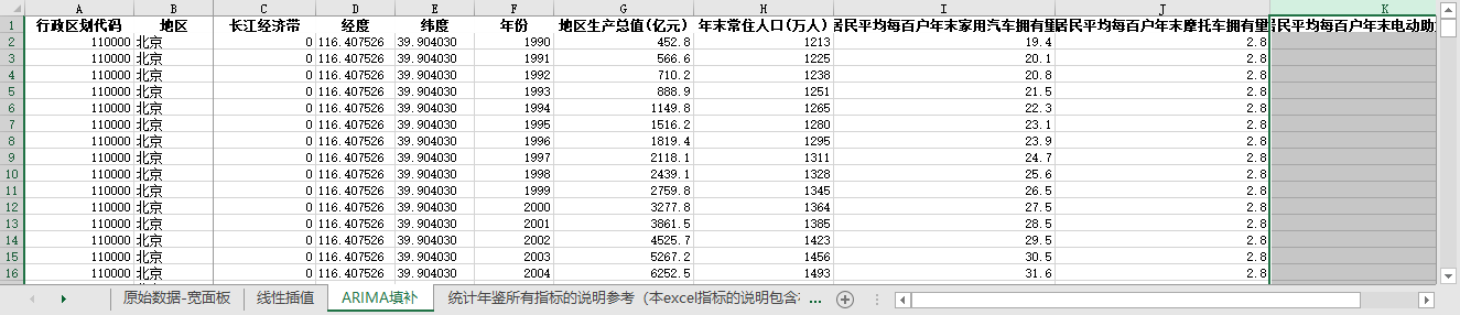 excel数据文件包原始数据-宽面板(由于多年度指标不同存在缺失值)、线性插值、ARIMA填补三个版本,提供您参考使用。
