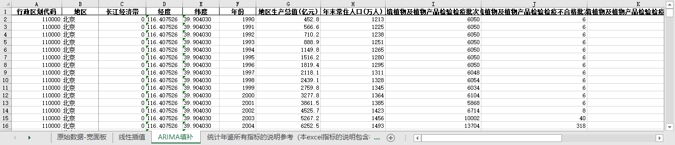 excel数据文件包原始数据-宽面板(由于多年度指标不同存在缺失值)、线性插值、ARIMA填补三个版本,提供您参考使用。