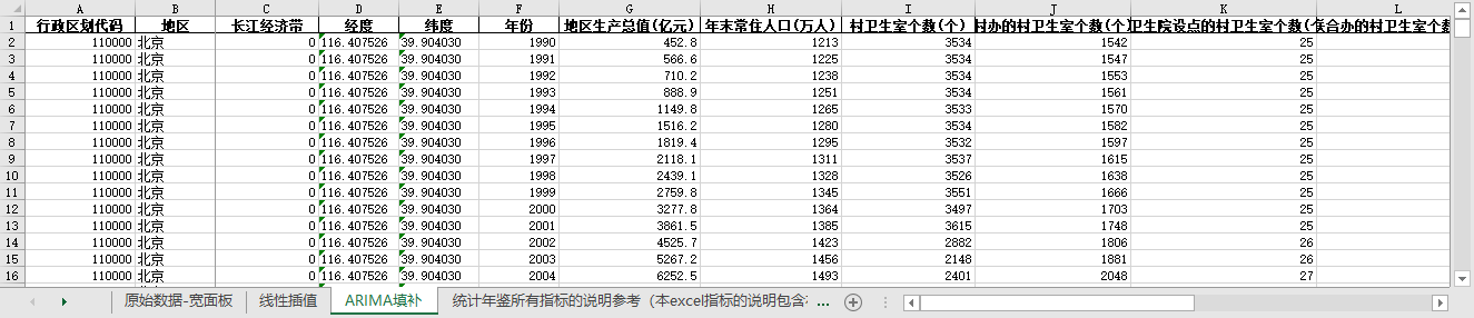excel数据文件包原始数据-宽面板(由于多年度指标不同存在缺失值)、线性插值、ARIMA填补三个版本,提供您参考使用。