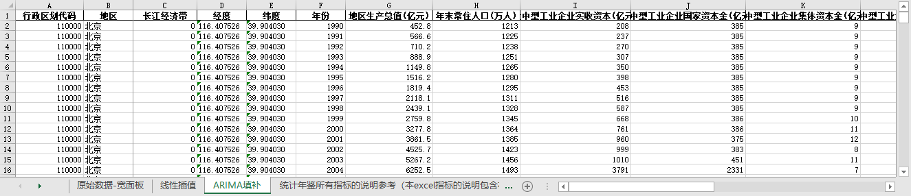excel数据文件包原始数据-宽面板(由于多年度指标不同存在缺失值)、线性插值、ARIMA填补三个版本,提供您参考使用。