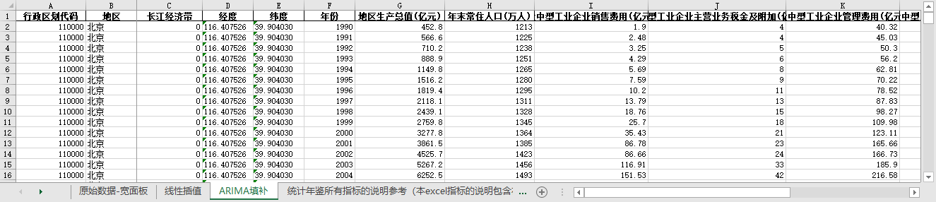 excel数据文件包原始数据-宽面板(由于多年度指标不同存在缺失值)、线性插值、ARIMA填补三个版本,提供您参考使用。