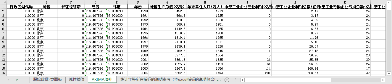excel数据文件包原始数据-宽面板(由于多年度指标不同存在缺失值)、线性插值、ARIMA填补三个版本,提供您参考使用。