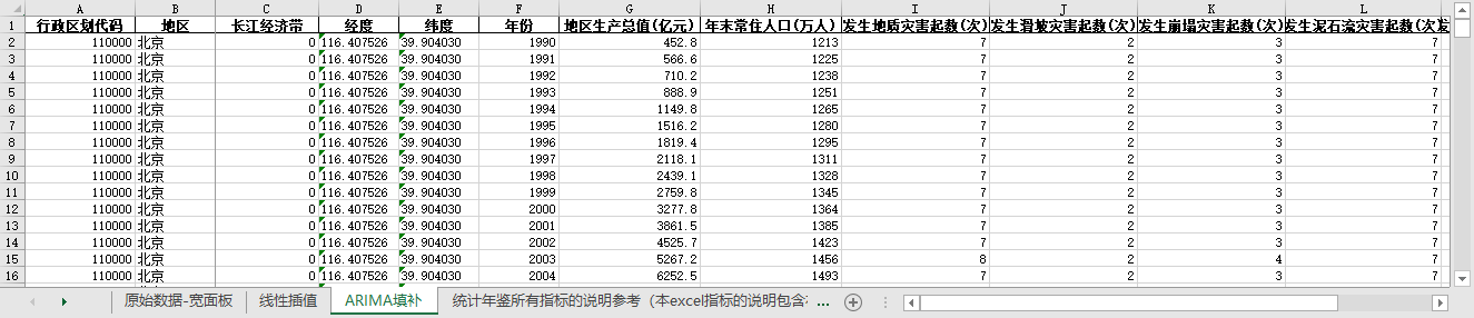excel数据文件包原始数据-宽面板(由于多年度指标不同存在缺失值)、线性插值、ARIMA填补三个版本,提供您参考使用。