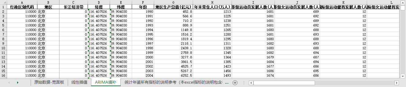 excel数据文件包原始数据-宽面板(由于多年度指标不同存在缺失值)、线性插值、ARIMA填补三个版本,提供您参考使用。