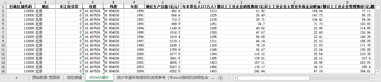 excel数据文件包原始数据-宽面板(由于多年度指标不同存在缺失值)、线性插值、ARIMA填补三个版本,提供您参考使用。