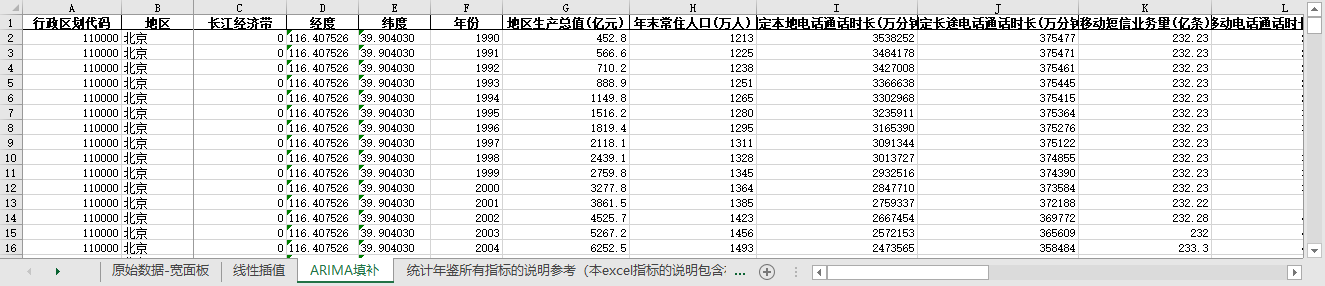 excel数据文件包原始数据-宽面板(由于多年度指标不同存在缺失值)、线性插值、ARIMA填补三个版本,提供您参考使用。