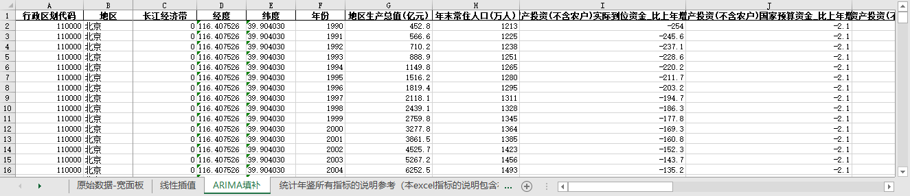 excel数据文件包原始数据-宽面板(由于多年度指标不同存在缺失值)、线性插值、ARIMA填补三个版本,提供您参考使用。