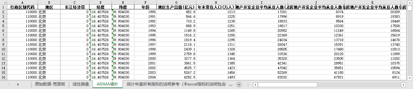 excel数据文件包原始数据-宽面板(由于多年度指标不同存在缺失值)、线性插值、ARIMA填补三个版本,提供您参考使用。