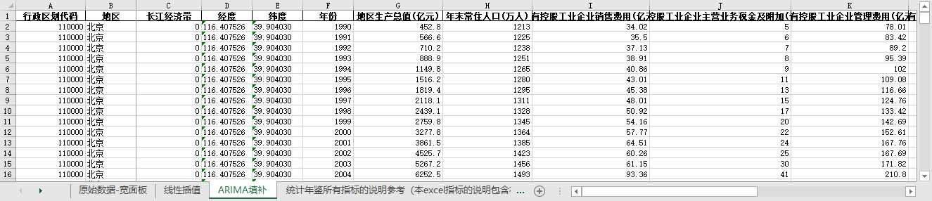 excel数据文件包原始数据-宽面板(由于多年度指标不同存在缺失值)、线性插值、ARIMA填补三个版本,提供您参考使用。