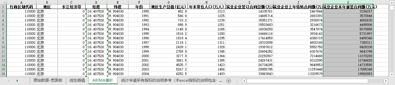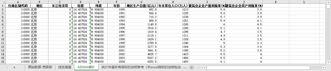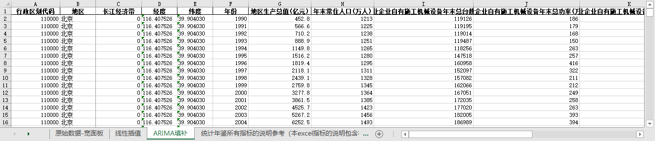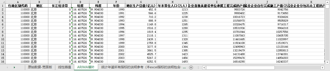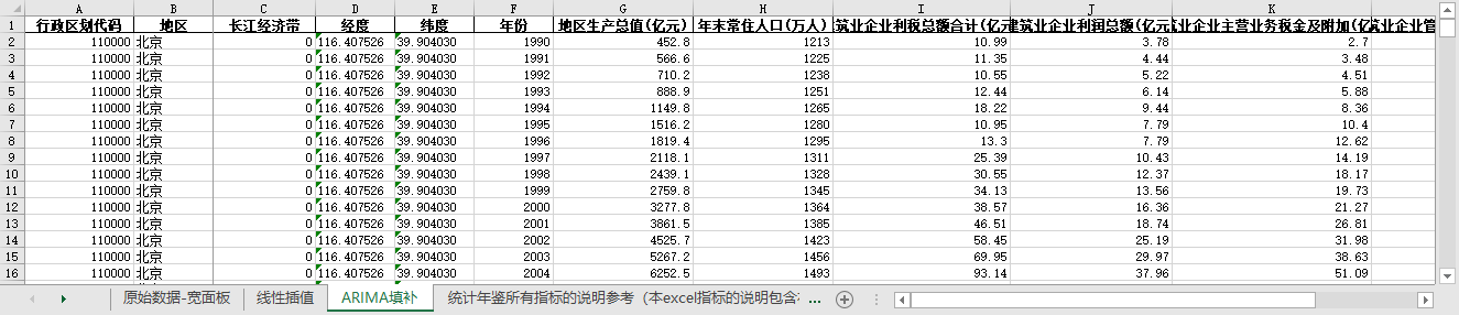 excel数据文件包原始数据-宽面板(由于多年度指标不同存在缺失值)、线性插值、ARIMA填补三个版本,提供您参考使用。
