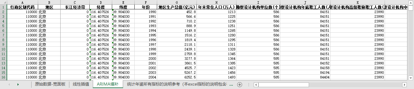 excel数据文件包原始数据-宽面板(由于多年度指标不同存在缺失值)、线性插值、ARIMA填补三个版本,提供您参考使用。
