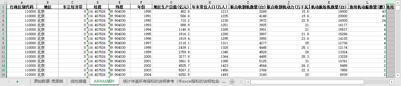 excel数据文件包原始数据-宽面板(由于多年度指标不同存在缺失值)、线性插值、ARIMA填补三个版本,提供您参考使用。