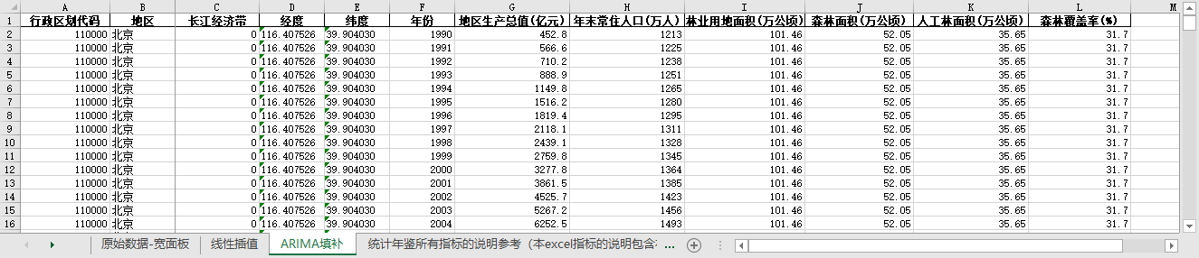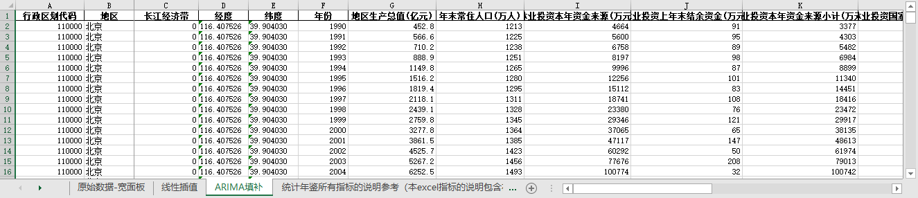excel数据文件包原始数据-宽面板(由于多年度指标不同存在缺失值)、线性插值、ARIMA填补三个版本,提供您参考使用。