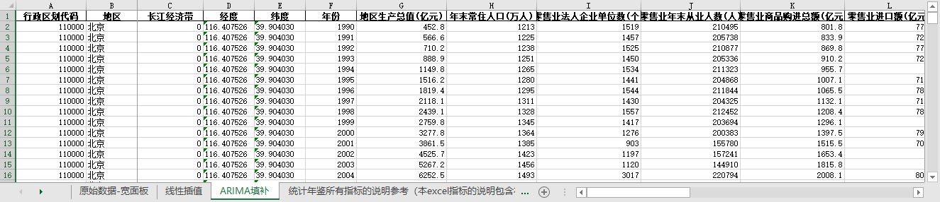excel数据文件包原始数据-宽面板(由于多年度指标不同存在缺失值)、线性插值、ARIMA填补三个版本,提供您参考使用。