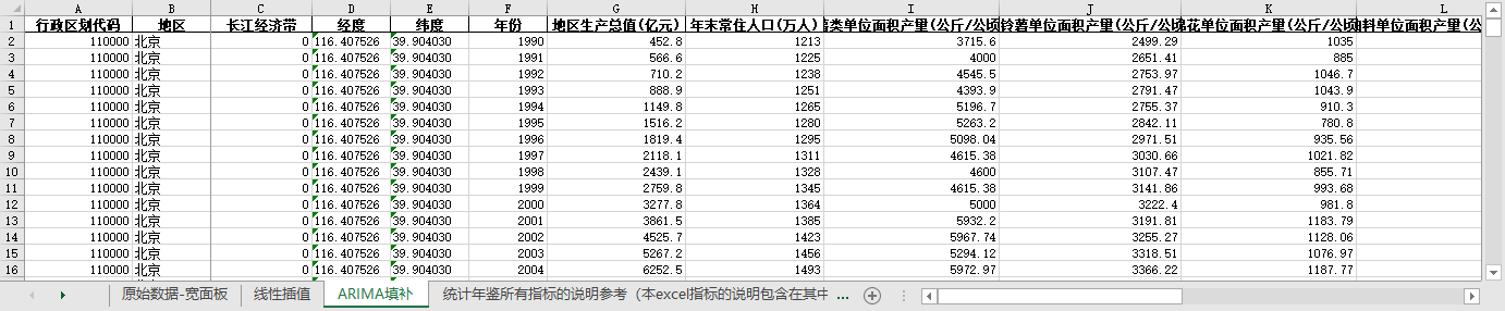 excel数据文件包原始数据-宽面板(由于多年度指标不同存在缺失值)、线性插值、ARIMA填补三个版本,提供您参考使用。
