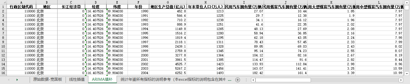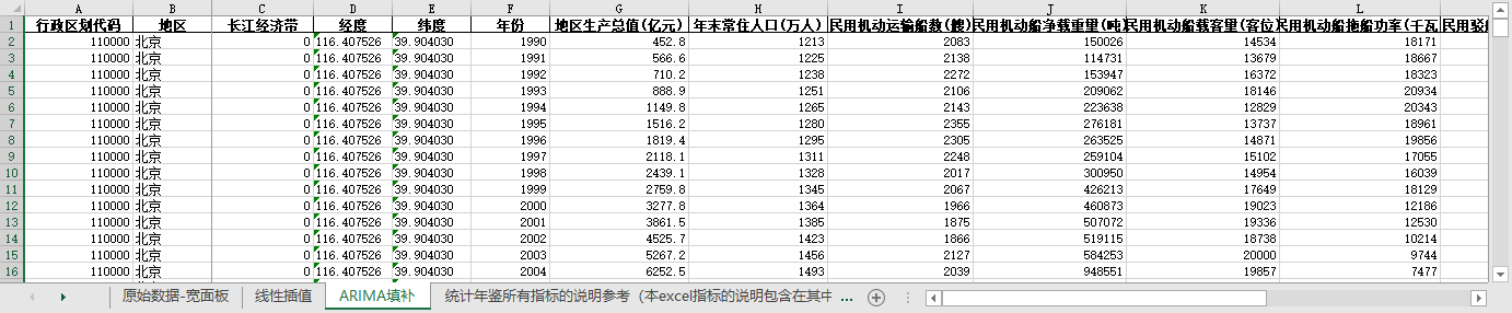 excel数据文件包原始数据-宽面板(由于多年度指标不同存在缺失值)、线性插值、ARIMA填补三个版本,提供您参考使用。