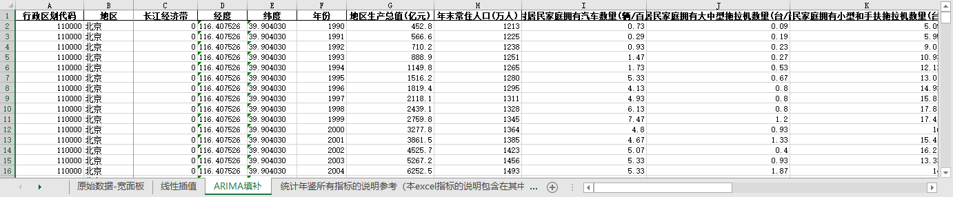 excel数据文件包原始数据-宽面板(由于多年度指标不同存在缺失值)、线性插值、ARIMA填补三个版本,提供您参考使用。