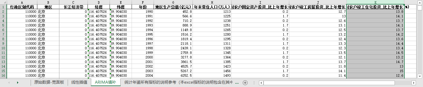 excel数据文件包原始数据-宽面板(由于多年度指标不同存在缺失值)、线性插值、ARIMA填补三个版本,提供您参考使用。
