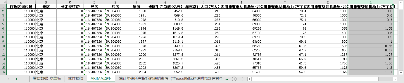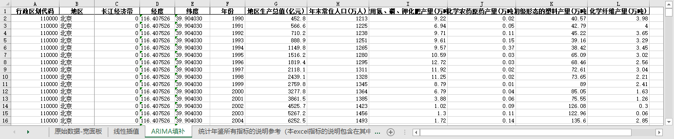 excel数据文件包原始数据-宽面板(由于多年度指标不同存在缺失值)、线性插值、ARIMA填补三个版本,提供您参考使用。