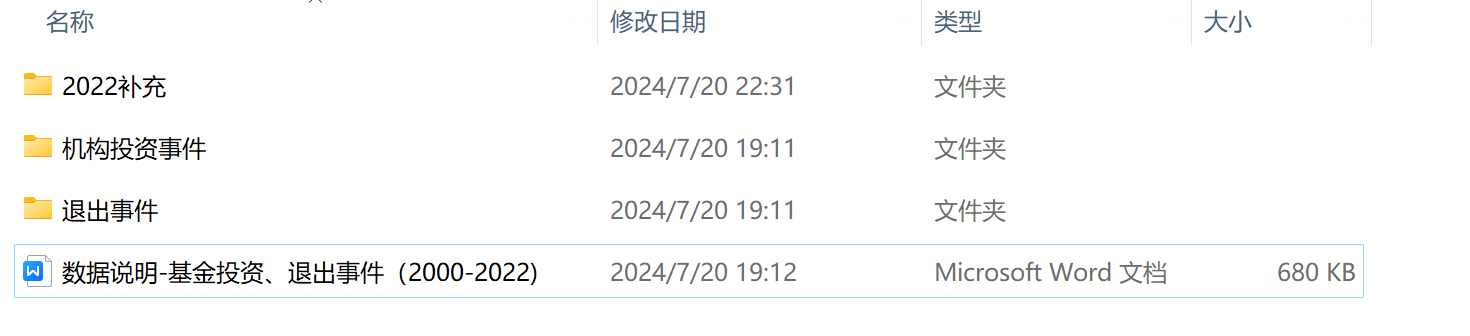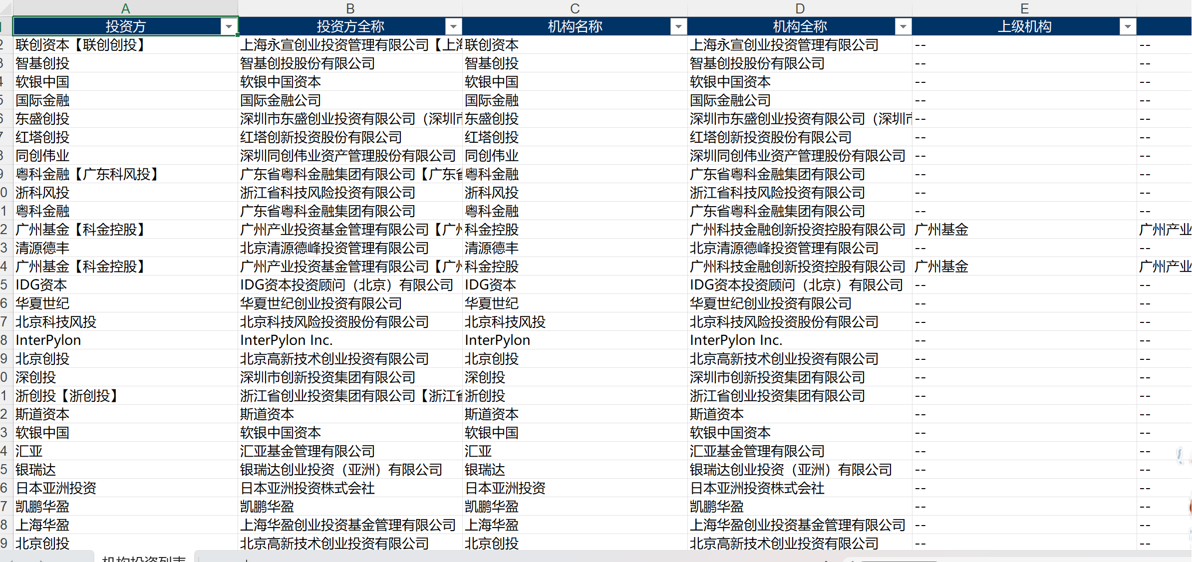 退出方 企业 退出方全称 企业全称 机构 行业(清科) 地区 退出时间 退出方式 账面回报(倍数) 内部收益率(%) 回报金额(RMB/M) 回报金额(USD/M) 交易所 行业(国标) 行业(证监会) 首次投资时间 首次投资轮次 末轮投资时间 投资方 投资方全称 机构名称 机构全称 上级机构 上级机构全称 基金名称 基金全称 企业名称 企业全称 企业标签 行业(清科) 地区 投资类型 投资阶段 投资时间 投资币种 投资金额(M) 投资金额(RMB/M) 投资金额(USD/M) 股权% 轮次 投资人 企业估值(RMB/M) 企业估值(USD/M) P/E 行业(国标) 行业(证监会) 上市交易所 企业简介