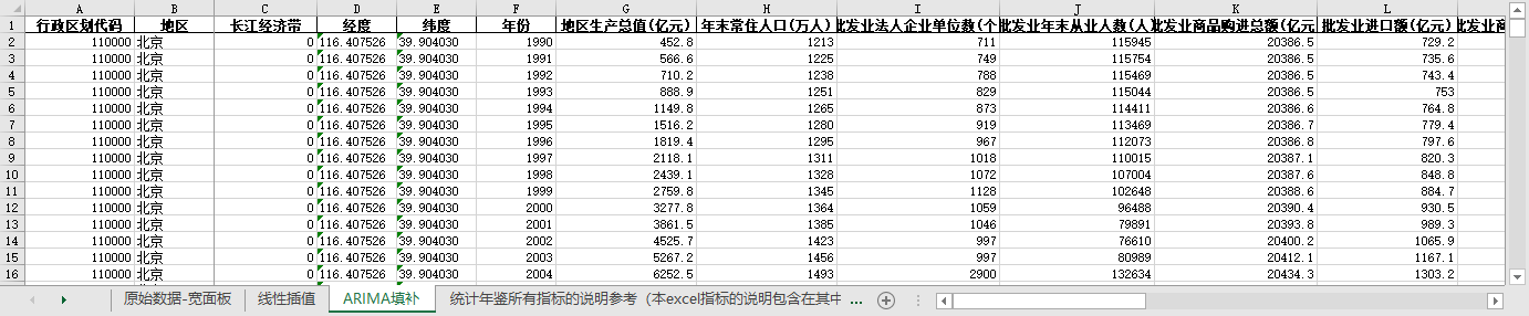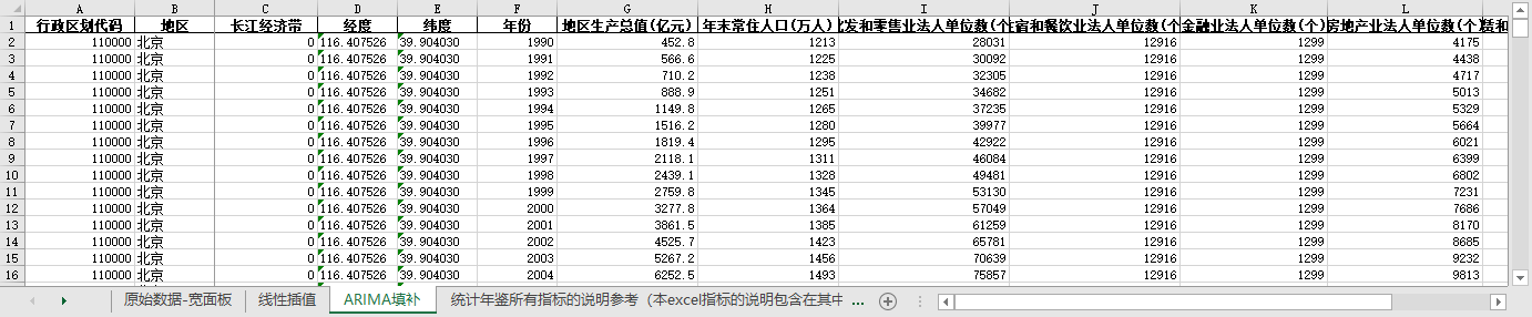 excel数据文件包原始数据-宽面板(由于多年度指标不同存在缺失值)、线性插值、ARIMA填补三个版本,提供您参考使用。
