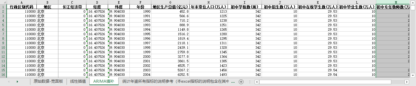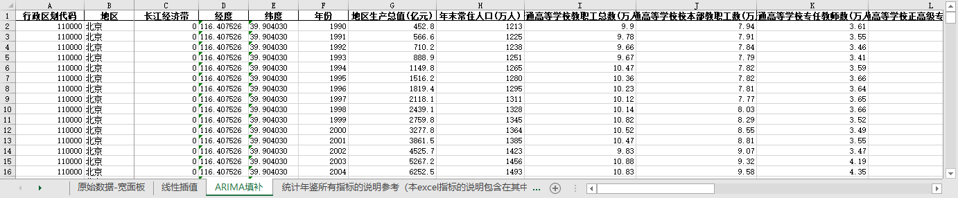 excel数据文件包原始数据-宽面板(由于多年度指标不同存在缺失值)、线性插值、ARIMA填补三个版本,提供您参考使用。