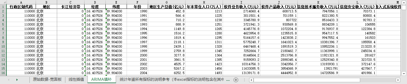 excel数据文件包原始数据-宽面板(由于多年度指标不同存在缺失值)、线性插值、ARIMA填补三个版本,提供您参考使用。