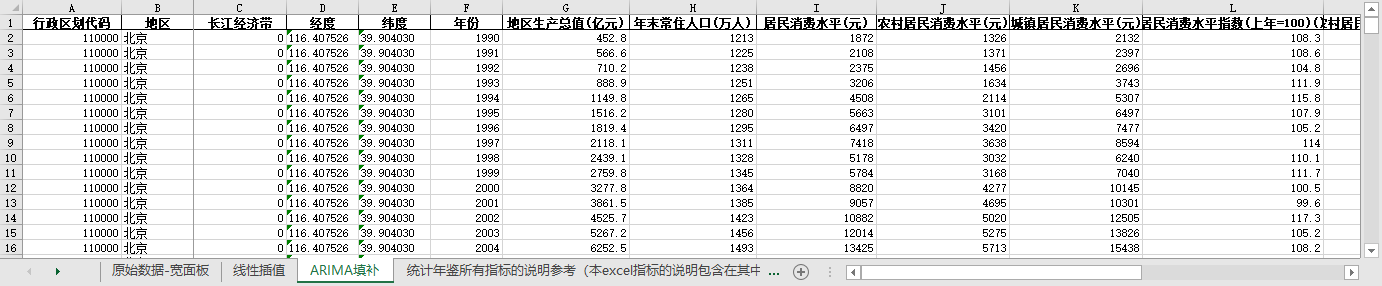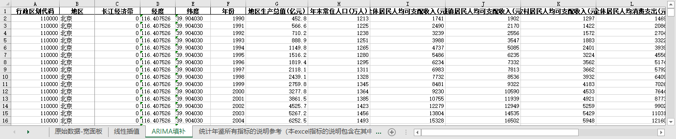 excel数据文件包原始数据-宽面板(由于多年度指标不同存在缺失值)、线性插值、ARIMA填补三个版本,提供您参考使用。