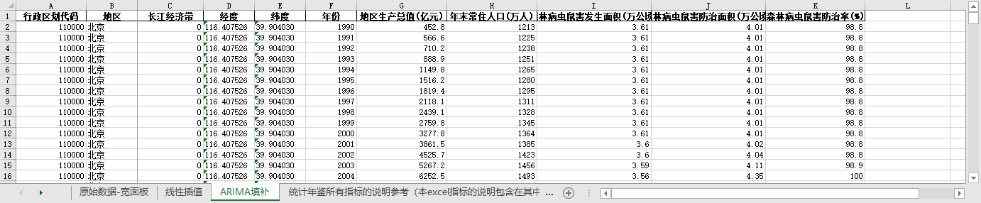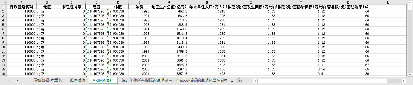 excel数据文件包原始数据-宽面板(由于多年度指标不同存在缺失值)、线性插值、ARIMA填补三个版本,提供您参考使用。