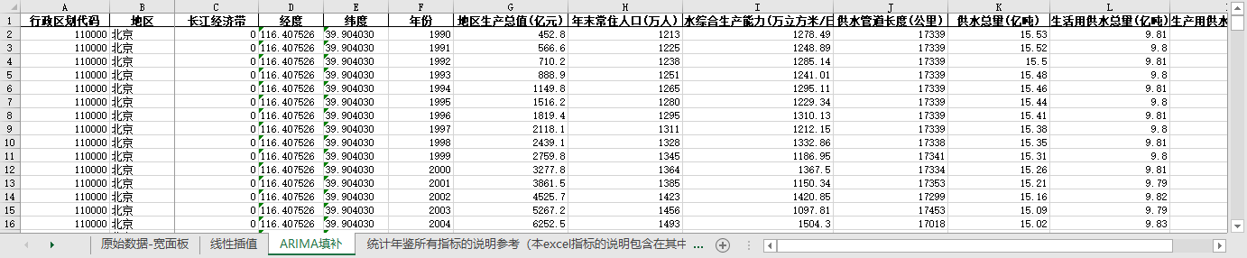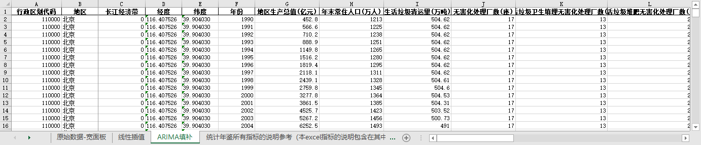 excel数据文件包原始数据-宽面板(由于多年度指标不同存在缺失值)、线性插值、ARIMA填补三个版本,提供您参考使用。