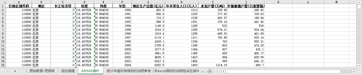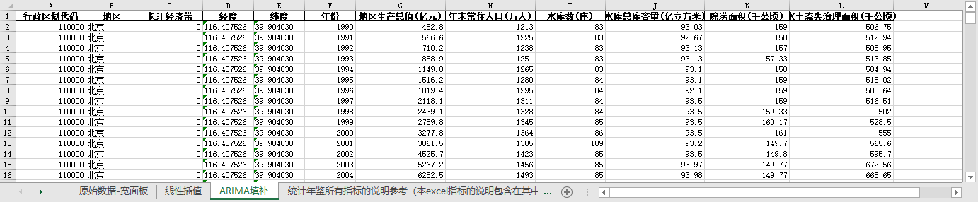 excel数据文件包原始数据-宽面板(由于多年度指标不同存在缺失值)、线性插值、ARIMA填补三个版本,提供您参考使用。