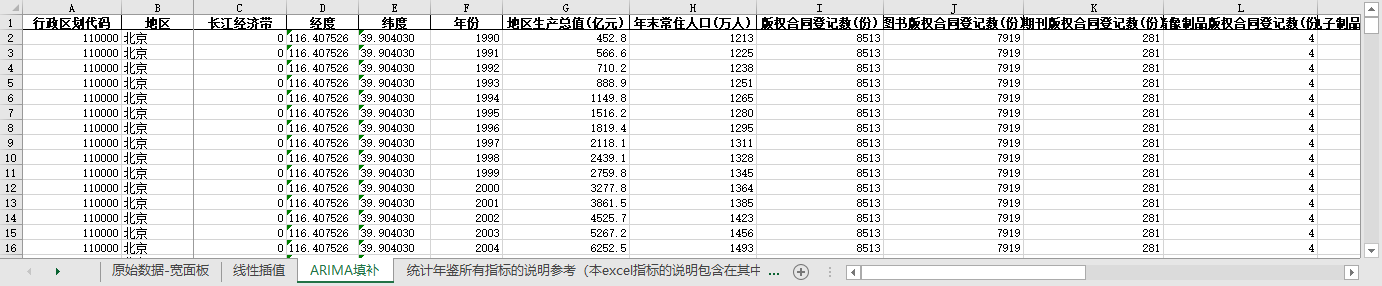 excel数据文件包原始数据-宽面板(由于多年度指标不同存在缺失值)、线性插值、ARIMA填补三个版本,提供您参考使用。