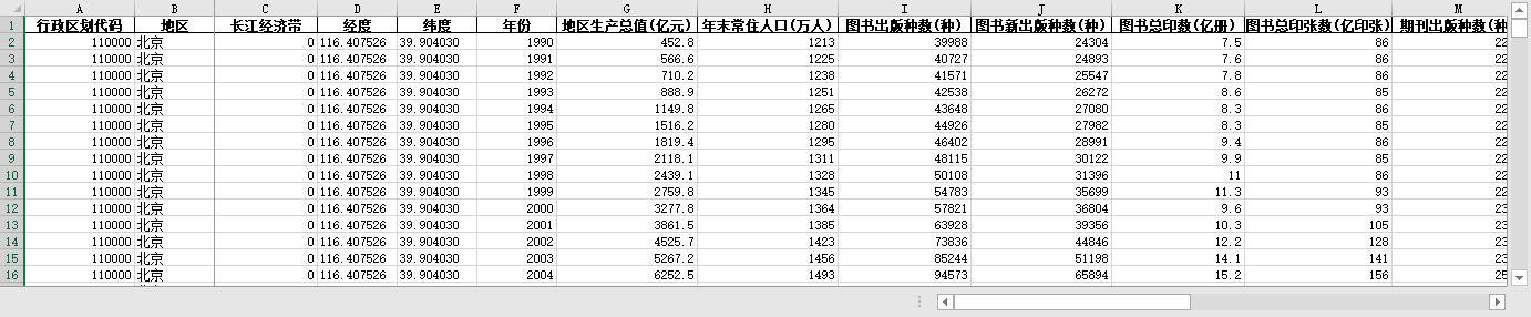 行政区划代码 地区 长江经济带 经度 纬度 年份 地区生产总值(亿元) 年末常住人口(万人) 图书出版种数(种) 图书新出版种数(种) 图书总印数(亿册) 图书总印张数(亿印张) 期刊出版种数(种) 期刊每期出版平均印数(万册) 期刊出版总印数(亿册) 期刊出版总印张数(亿印张) 报纸出版种数(种) 报纸每期出版平均印数(万册) 报纸出版总印数(亿份) 报纸出版总印张数(亿印张)