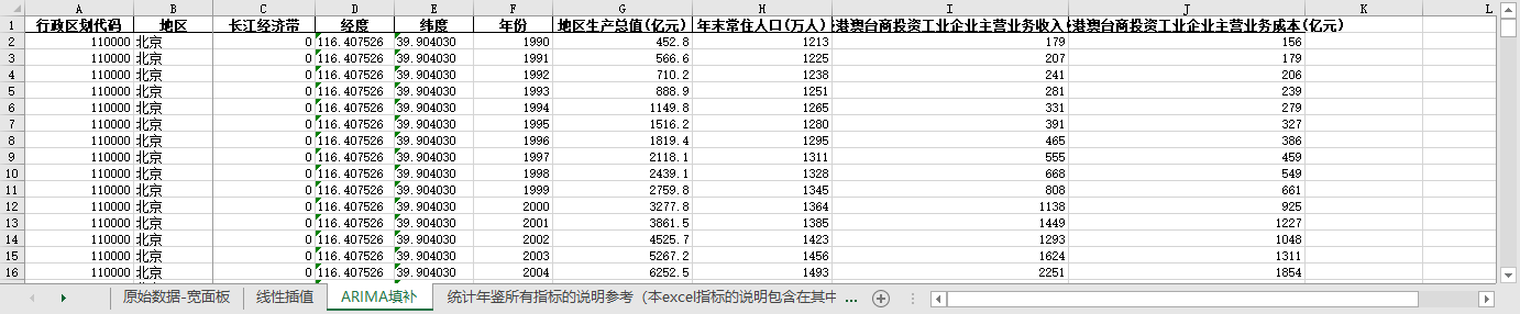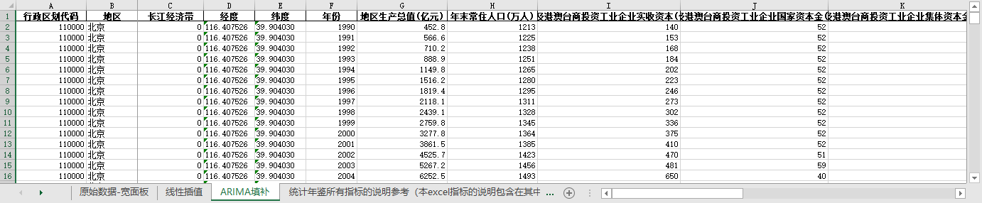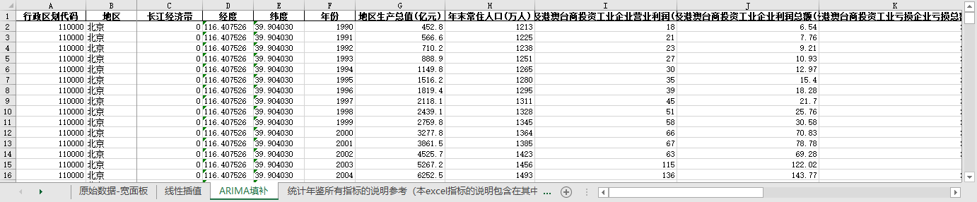 excel数据文件包原始数据-宽面板(由于多年度指标不同存在缺失值)、线性插值、ARIMA填补三个版本,提供您参考使用。