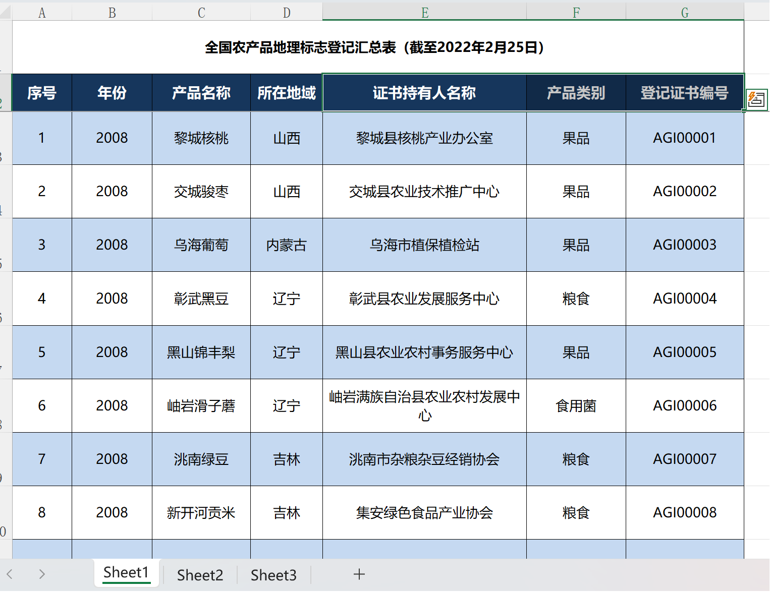 数据名称:各省份三农数据之农产品地理标志登记汇总表08-22年数据