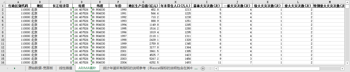 excel数据文件包原始数据-宽面板(由于多年度指标不同存在缺失值)、线性插值、ARIMA填补三个版本,提供您参考使用。