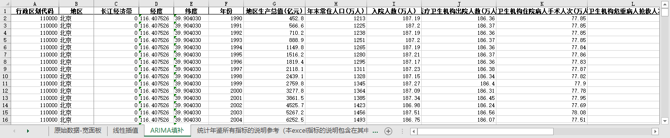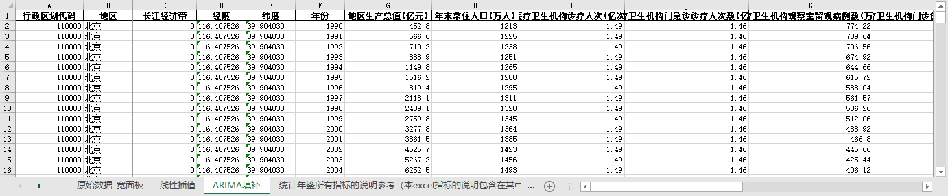 excel数据文件包原始数据-宽面板(由于多年度指标不同存在缺失值)、线性插值、ARIMA填补三个版本,提供您参考使用。
