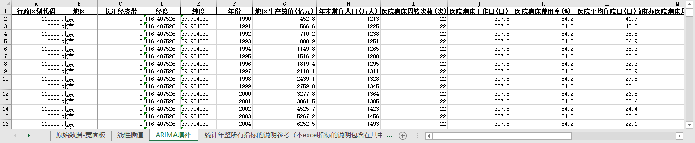 excel数据文件包原始数据-宽面板(由于多年度指标不同存在缺失值)、线性插值、ARIMA填补三个版本,提供您参考使用。