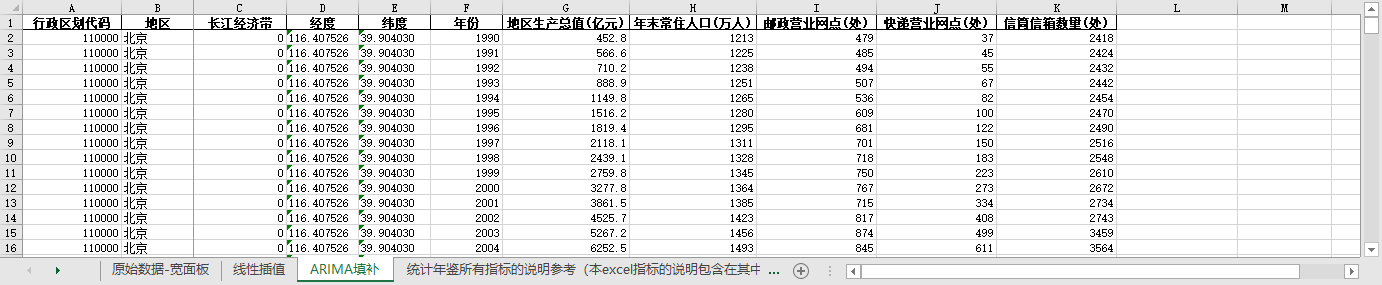excel数据文件包原始数据-宽面板(由于多年度指标不同存在缺失值)、线性插值、ARIMA填补三个版本,提供您参考使用。
