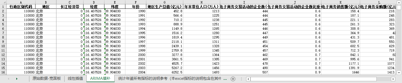 excel数据文件包原始数据-宽面板(由于多年度指标不同存在缺失值)、线性插值、ARIMA填补三个版本,提供您参考使用。