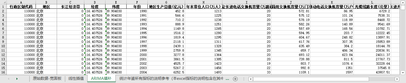 excel数据文件包原始数据-宽面板(由于多年度指标不同存在缺失值)、线性插值、ARIMA填补三个版本,提供您参考使用。