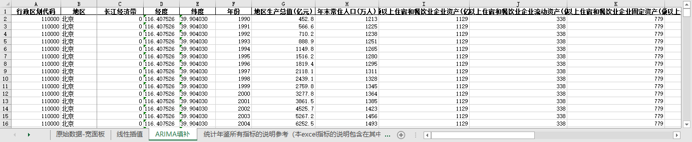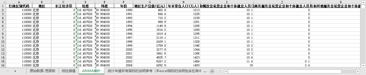 excel数据文件包原始数据-宽面板(由于多年度指标不同存在缺失值)、线性插值、ARIMA填补三个版本,提供您参考使用。