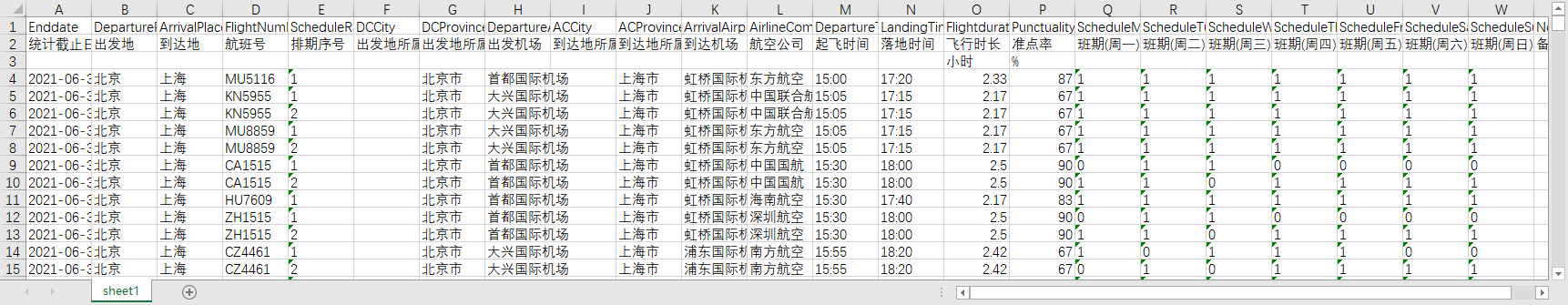 统计截止日期 出发地 到达地 航班号 排期序号 出发地所属市 出发地所属省 出发机场 到达地所属市 到达地所属省 到达机场 航空公司 起飞时间 落地时间 飞行时长 准点率 班期(周一) 班期(周二) 班期(周三) 班期(周四) 班期(周五) 班期(周六) 班期(周日) 备注